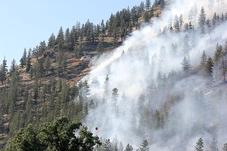 A Forest Service helicopter makes a water drop over the West Mullan Fire early Sunday evening.