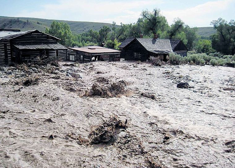 This photo provided by Montana State Parks shows flood water running down the main street of Bannack on Wednesday. The flooding destroyed one building from the 1800s, washed out the town's boardwalk and caused flooding damage to dozens of other properties. The annual celebration Bannack Days scheduled for this weekend has been canceled and officials say the park has been closed until further notice. (AP Photo/Montana State Parks Department)