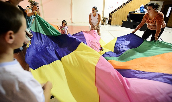 Dana Blair, center, leads parents and kids in a game of parachute July 18 at The Gym, the Evergreen building that Family Friendly Flathead calls home. The nonprofit organization hosts a free Toddler Tyme every Thursday from 10:30 a.m. to noon at The Gym; the weekly event is a big draw for neighborhood children ages 1 to 6.