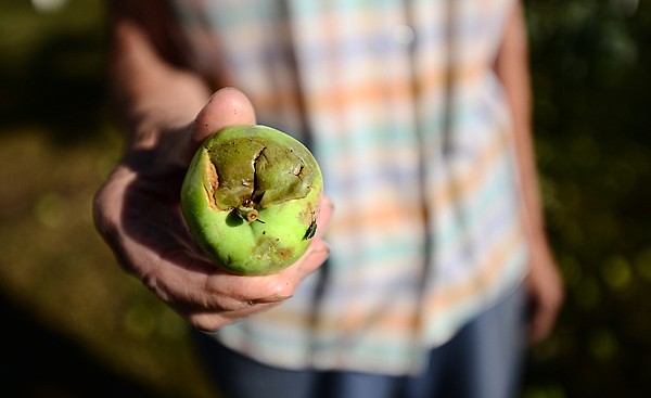 Jeannie Baldwin, 87, picks up a Duchess apple damaged in Wednesday's storm.