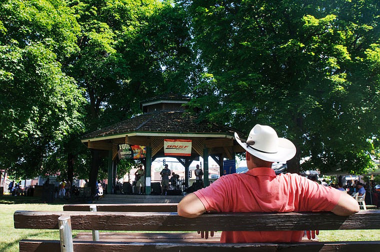 Brad Emmert of Bigfork listens Barnyard Riot on Friday afternoon at Arts in the Park in Kalispell at Depot Park. July 19, 2013 in Kalispell, Montana. (Patrick Cote/Daily Inter Lake)