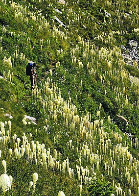 Rounding the corner after descending the peak, a hidden avalanche chute brimmed with blooming bear grass.