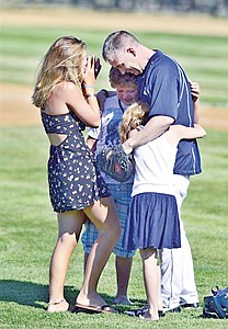 Ed McNamee, a Montana Army National Guardsman, returned home from a long deployment overseas and surprised his children before the Great Falls Electrics games, Tuesday, July 16, 2013 at Centene Stadium in Great Falls, Mont. Ed McNamee's homecoming after seven months in Afghanistan was a home run with his 10-year-old son. (AP Photo/The Great Falls Tribune, Rion Sanders) NO SALES