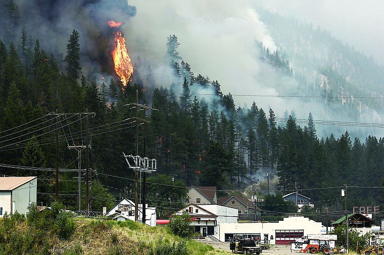 Flames from the West Mullan Fire flare on the hillside above downtown Superior Thursday.