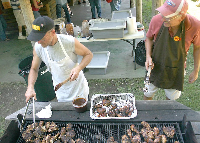 Bob Butte and Wally Gibe man one of the grills at the annual Chicken Jamboree where 350 pounds of chicken were consumed. The annual event helps raise money for the Men's Prayer Breakfast Group in Thompson Falls.