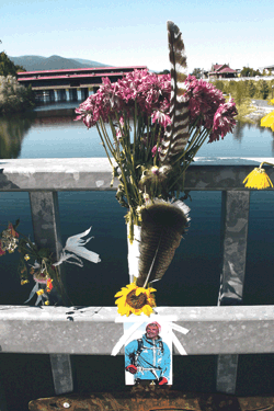A makeshift memorial with a dozen bouquets has been erected on the bridge’s north railing.