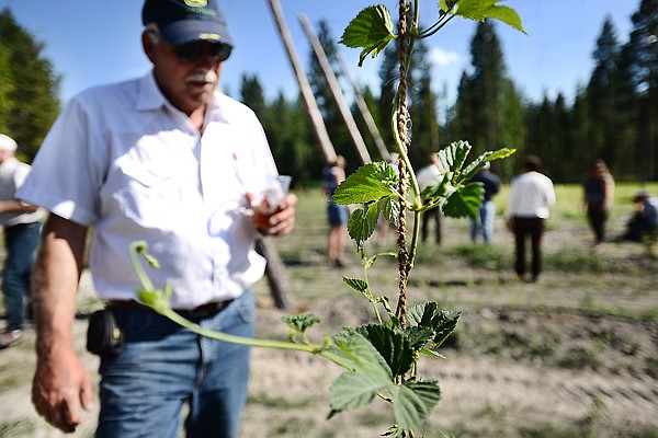 Above, Whitefish area farmer Tom Christianson examines one of the varieties in hops trials at Tom Britz’s ranch south of Whitefish Wednesday afternoon. Christianson has been helping with the trial project, which is in its first year. Among those who took part in a tour were representatives with the Montana Department of Agriculture and from Great Northern Brewing Co. in Whitefish and Tamarack Brewing Co. in Lakeside. Both breweries have helped sponsor the trials because they are interested in a locally grown ingredient.