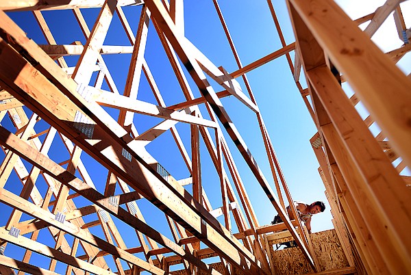 Gabe Thomas, president of GT Builders Inc., works on a house under construction on Glacier Circle near Whitefish Stage Road on Friday, July26, in Kalispell. (Brenda Ahearn/Daily Inter Lake)