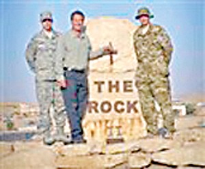 In this Tuesday, July 23, 2013 photo provided by the Montana governor's office, Montana Gov. Steve Bullock, center, poses with two unidentified members of the Montana National Guard at the Montana National Guard 1-189th General Support Aviation Battalion at Ali Al Salem Air Base, Kuwait, also known as "The Rock". Bullock is on a three-day trip to Kuwait and Afghanistan to visit with the Montana troops deployed there. (AP Photo/Montana Governor's office)