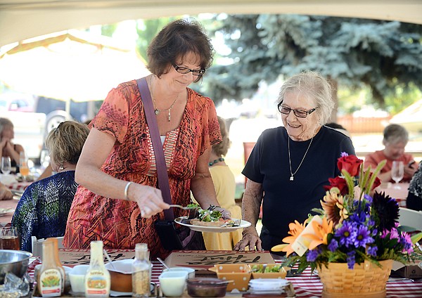 Shellie Pitman of Kalispell, left, a former nurses aid, joins Marj Hensen and a group of retired nurses for lunch and dessert on Thursday afternoon, July 25. The nurses have been gathering every Thursday for years. Having the luncheon at her home, under a tent in the front yard has been one of Marj's bucket list items. (Brenda Ahearn/Daily Inter Lake)