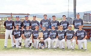 Back row: Head Coach Kelly Morford, left, Assistant Coach Jack Helber, Joshua Foote, Jared Winslow, Oliver Grupenhoff, Austin Marshall, Cameron Burkes, Assistand Coach Wally Winslow. Front row: Luke Haggerty, Will Reichel, Isaak Jones, bat boy Bransen Holzer, Micah Germany, Collin Johnson, Dylan Lane, Andrew Haggerty and Dylan Berget.