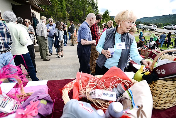 Liz Seabaugh, treasurer for the Foy's to Blacktail organization and other cast sort through items for auction at the fundraiser on Saturday, June 1, at Herron Park. More than $3,000 was raised. The organization is preparing to make their next land purchase on July 31. (Brenda Ahearn/Daily Inter Lake)