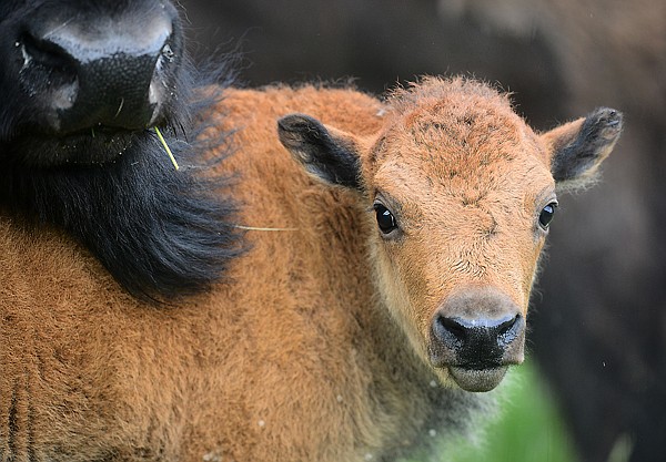 A protective mother bison rests her chin on the back of her baby on Friday at the Spring Brook Yak Ranch near Kalispell. (Brenda Ahearn/Daily Inter Lake)