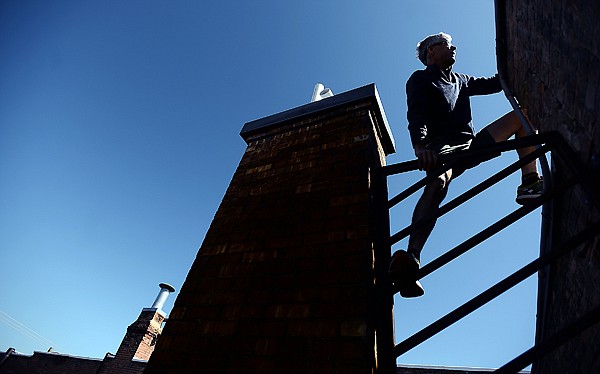 Don Scharfe of Rocky Mountain Outfitter, climbs to the roof of the building to take a look at the new sculpture on Tuesday afternoon, June 4, in Kalispell. (Brenda Ahearn/Daily Inter Lake)