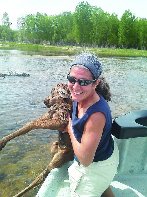 Karen Sciascia holds a baby moose she and Twin Bridges guide Seth McLean rescued from the Big Hole River on Saturday.