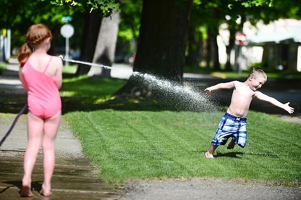 Cannon Wride, 4, right, runs from his sister Bailey, 8, as they play with the water hose in their yard on Thursday afternoon, June 6, in Kalispell. (Brenda Ahearn/Daily Inter Lake)