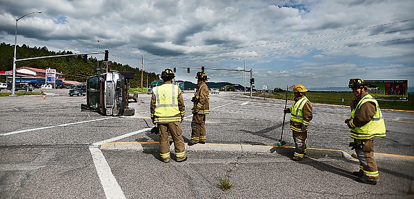 Members of the Somers-Lakeside Fire Department respond to the scene of a two vehicle accident on Friday, June 7, at the intersection of Highway 93 and Highway 82 north of Somers. (Brenda Ahearn/Daily Inter Lake)