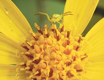 Stopping to smell a wildflower — particularly a yellow or white one — may bring you eye-to-eye with a crab spider.