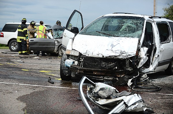 This minivan sustained major damage and its driver was injured when it was struck head-on by the passenger car in the background on U.S. 2.