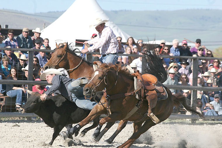 A competitor lands on his target during the steer wrestling event at the Homesteader Days Rodeo in Hot Springs.