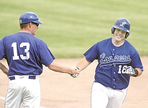 Micah Germany is all smiles as he rounds third base after hitting a 2-run homer in the bottom of the second with one out to tie the game at 2. First of a doubleheader vs. Glacier B Friday evening 6-7-13.