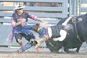 Hats off to bullfighter Lyle Miller for getting Shadrick Rich of St. Regis out of this predicament Saturday evening. The offending bull was known as "Cake Boss."