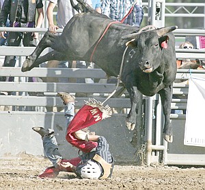For their size these animals are amazingly agile! Below is Jessie Tucker of Bonners Ferry exiting the bull known as "Mad Dog" Saturday evening during the Incredi-Bull bull riding event at J. Neils Park.