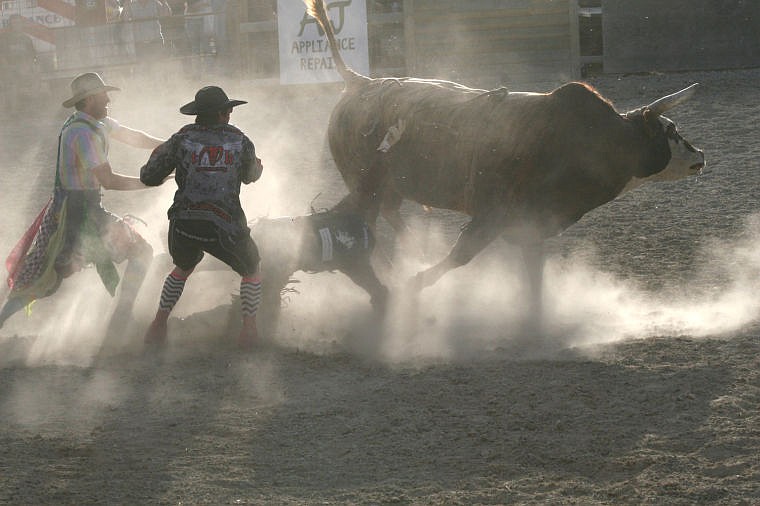 Bull fighters Cody Morris and Tyler McDade assist a rider that was tangled up with the bull.