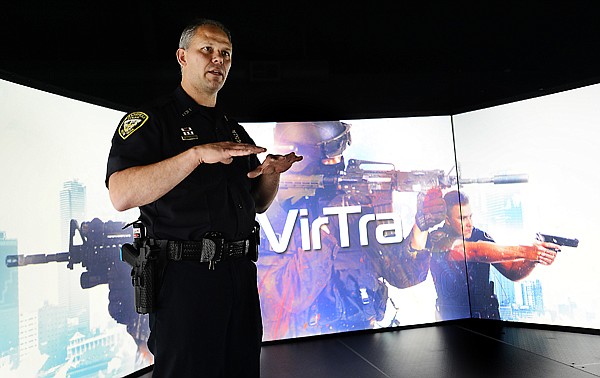 Bob Hughes ran through one of the use-of-force training scenarios that will be made available to the public. It has the participant waiting for a woman to finish using an automated teller machine when a man with a knife comes up to steal her purse.