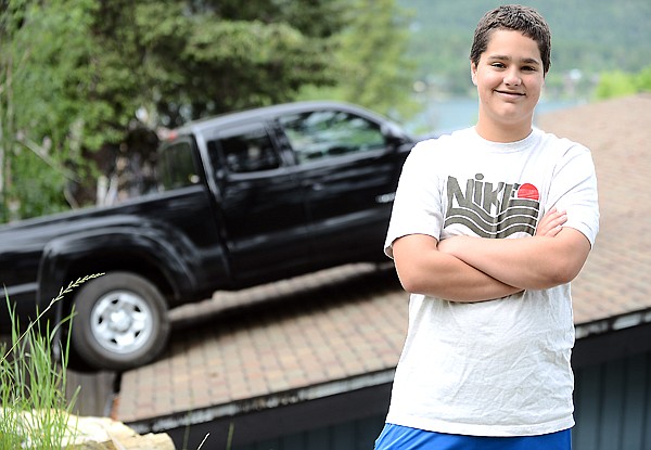 Brady Campbell, 14, was the only one home when a black Toytota truck, in background, rolled down the hill and onto the roof of the Campbell's second story apartment. (Brenda Ahearn/Daily Inter Lake)