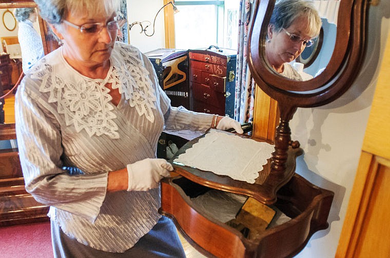 Mary Meisters slides back the cover of a shaving station Wednesday afternoon at Conrad Mansion in Kalispell. June 12, 2013 in Kalispell, Montana. (Patrick Cote/Daily Inter Lake)