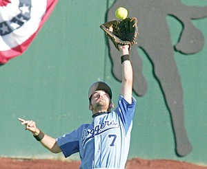 Centerfielder Andrew Haggerty with the first out bottom of the seventh during the Alumni game Saturday afternoon.