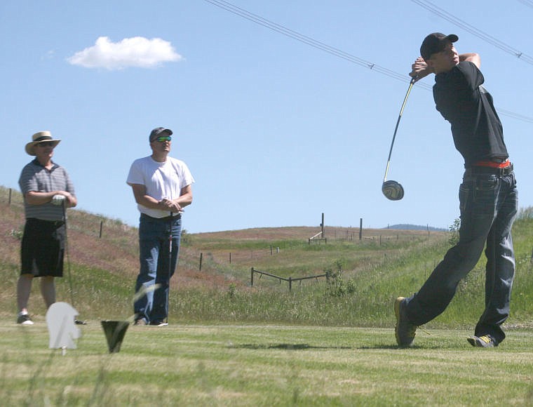 From left to right: Assistant Golf Coach Barry Fowler and Carl Benson look on as Cole Benson drives the ball off the tee during a fundraiser for the PHS golf team on Father's Day Sunday.