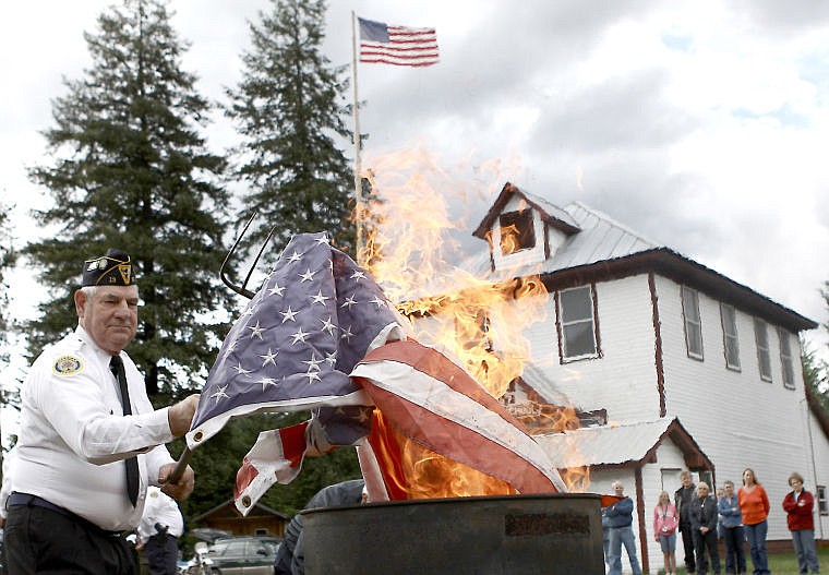 The ceremony involved members of the American Legion standing at attention while battered and used flags were presented to the commander of St. Regis Post #13.