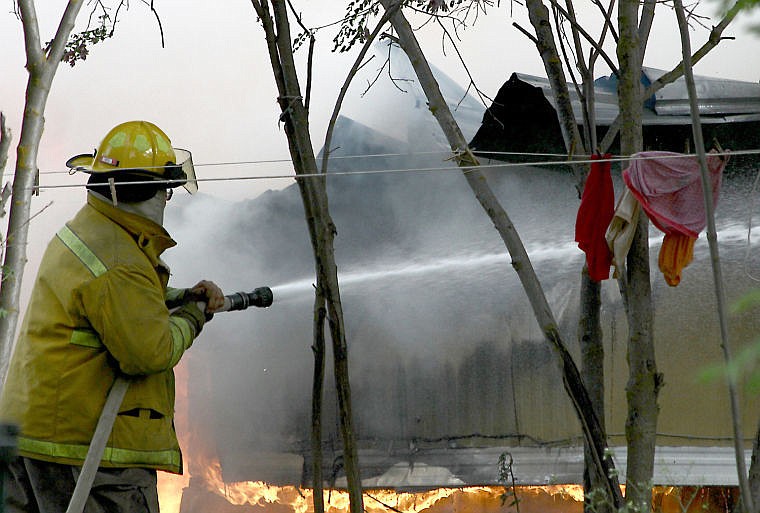 A member of the Superior Volunteer Fire Department uses a hose on the engulfed trailer.