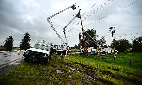 A crew from Flathead Electric Cooperative works on a damaged power pole near the intersection of U.S. 35 and Dyer Road north of Bigfork Thursday. The pole was struck by a vehicle early Thursday, damaging a transmission line and cutting power to the surrounding area.