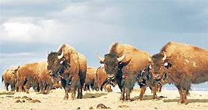 File-In an April 24, 2012 file photo a herd of bison are on the Fort Peck Reservation near Poplar, Mont. The Montana Supreme Court has reversed a lower court ruling that blocked transfers of Yellowstone National Park bison as part of a government-sponsored conservation initiative. (AP Photo/Matthew Brown,File)