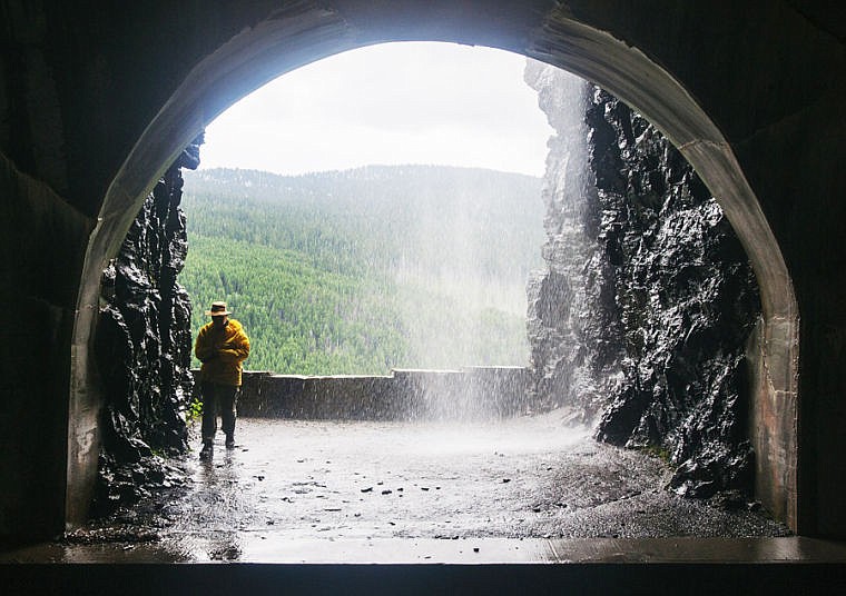 Steve Crumley of Raleigh, N.C., tries to avoid falling water Friday afternoon after taking in the view from the West Side Tunnel on Going-to-the-Sun Road.