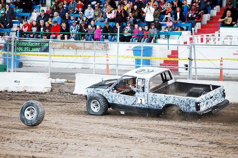 Kelly Byrd of Kalispell loses a tire during the first round of the Tuff Truck challenge Friday night during the Mega Monster Truck Tour at Flathead County Fairgrounds. June 21, 2013 in Kalispell, Montana. (Patrick Cote/Daily Inter Lake)