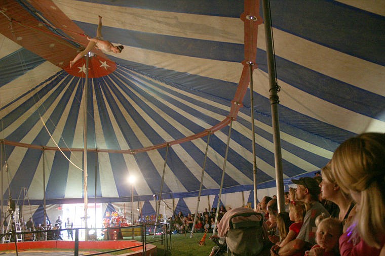 Simone Dykes soars high above the crowd during her trapeze routine in Thompson Falls on Saturday.