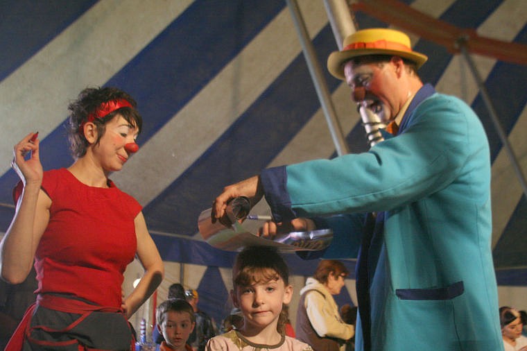 Judy and Punchy the clowns sign a poster for Shiann Hall of Thompson Falls during intermission of the Culpepper and Merriweather Circus on Saturday. The company put on two shows before moving on to Libby on Sunday. The cast and crew produce two shows a day, seven days a week for 8 months straight.