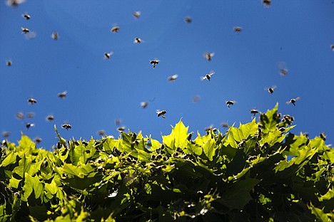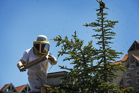 Paul Eloe, a hobbyist beekeeper, removed a displaced hive of bees from the tree at the corner of the Cd'A chamber office on First and Sherman on Friday. His brother, John, who works at the Coeur d'Alene Resort, called Paul to help out with a swarm of honey bees Friday morning after they had lodged themselves in a tree near the Resort's First Street entrance.