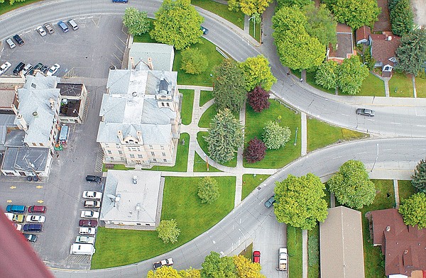 Some of the scene has changed since this 2002 aerial photo was taken of the county courthouse complex — traffic around the courthouse is now one instead of two lanes and the two buildings flanking the old courthouse have been removed. State highway officials have revived plans to rebuild the couplet around the courthouse. Options include two lanes on each side or all four lanes of U.S. 93 rerouted to the east side — at the bottom in this photograph. (Daily Inter Lake file photo)