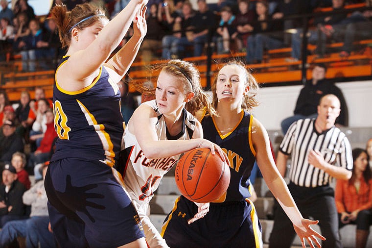 Flathead senior Dani Davis (11) looks to pass the ball under heavy defensive pressure by two Missoula Big Sky players.