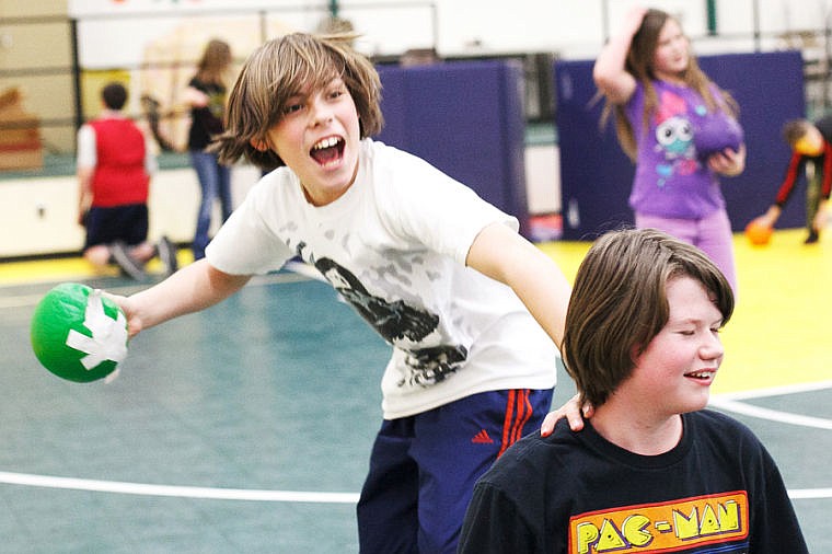 Kila sixth-grader Blake Counts, left, lines up a shot behind the cover of classmate Clay McAlister during a game of medic dodgeball during the Kila Fit Kids Club at Kila School. After being hit by balls, students had to do a series of jumping jacks, sit-ups or pushups to get back into the game. The Kila Fit Kids Club is a fitness and nutrition program put on by Kila School, a pilot member of the Big Sky Fit Kids.