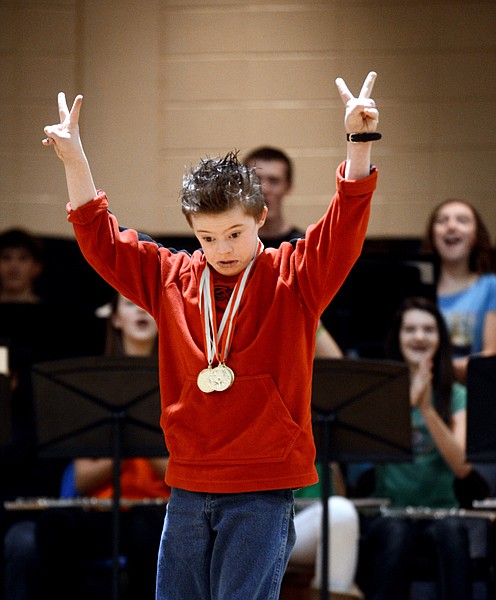 Nathaniel Mycroft celebrates his medals as he climbs the podium at the Kalispell Middle School Special Olympics Award Ceremony on Friday morning, March 1. Students filled the old gym to cheer for the six athletes. (Brenda Ahearn/Daily Inter Lake)