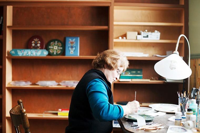 A year ago in February, Brosten began spending Fridays rosemaling with Wallace in the kitchen of her home in Big Arm. She spends part of her week getting her wood plaque projects ready to take down to her lessons.