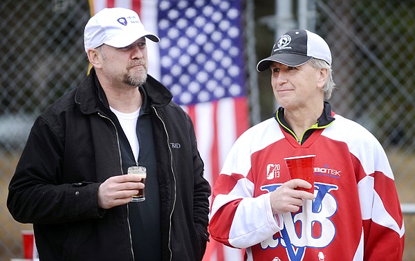 From left, Colin Patterson, formerly of the Calgary Flames, talks with Geoff Cox of Lethbridge, Alberta, on Saturday afternoon, March 2, at the Brewers Cup Hockey Challenge and Brewfest at Woodland Park in Kalispell. (Brenda Ahearn/Daily Inter Lake)