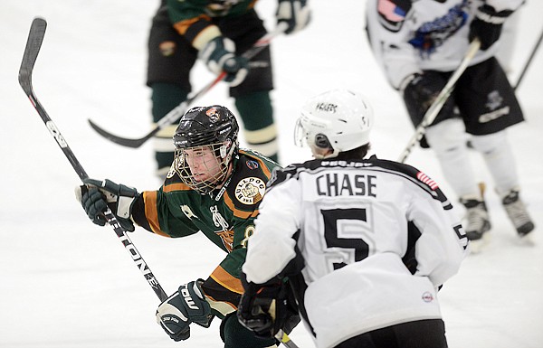 The Glacier Nationals Chris Cutshall (8) pushes past Dylan Chase (5) of the Missoula Maulers during their game on Saturday in Whitefish.