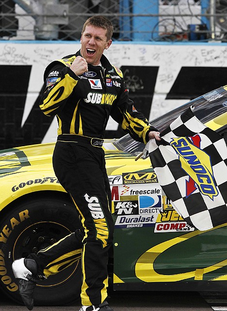 AVONDALE, Ariz. - Carl Edwards climbed from his car, stood on the door and landed a backflip near the finish line. He then hopped up on the wall in front of the grandstand, grabbed the checkered flag and waded into the crowd, trading high-fives with fans.